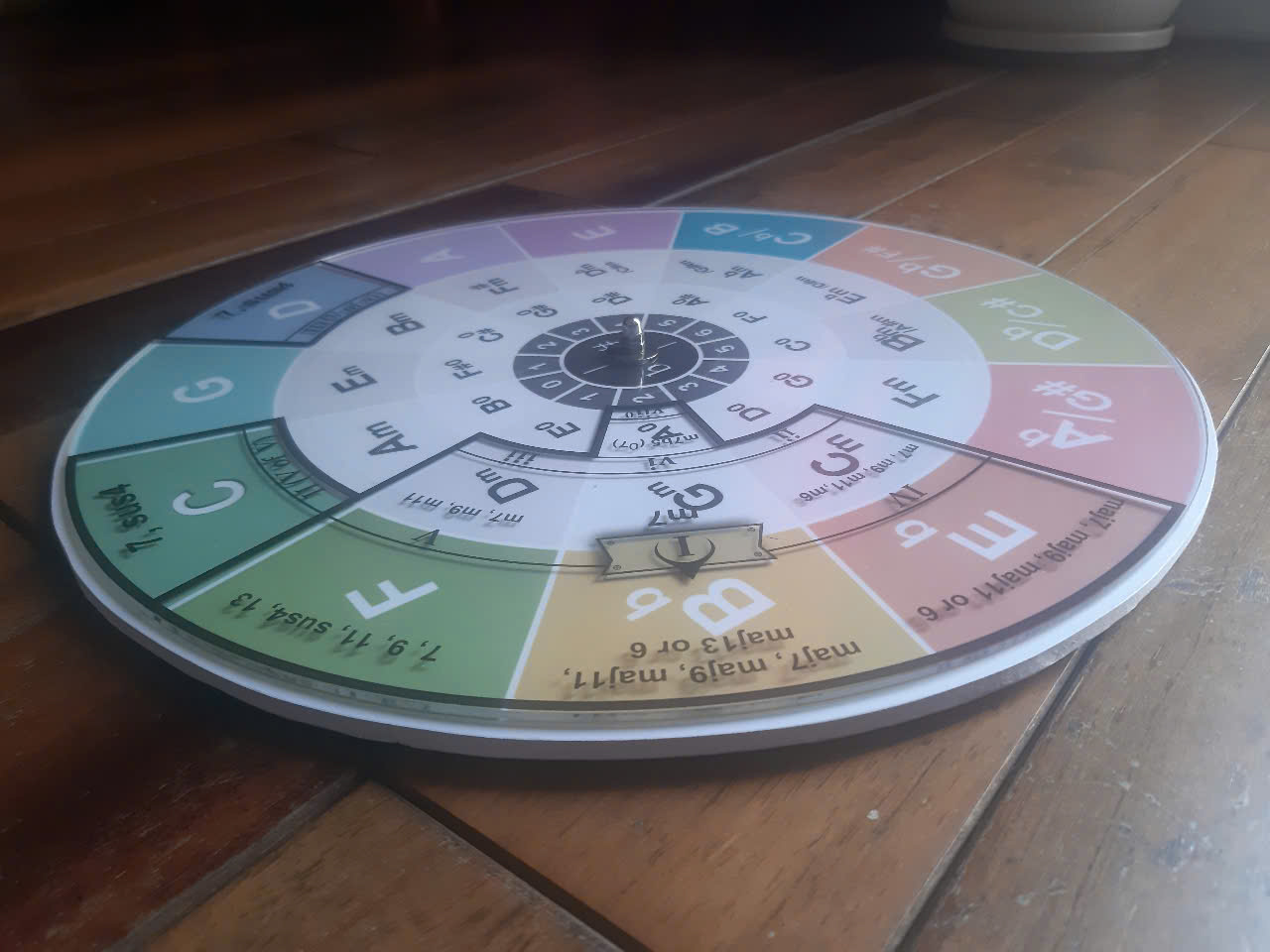 Mặt sau hướng dẫn vài chức năng chính của vòng tròn. Miếng thẻ xoay in bảng nhỏ thông tin các nốt giáng và thăng của 1 âm giai (scale)